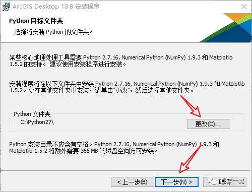 6.选择Python安装位置,默认C盘,也可以更换至其它盘。如果前面更改了安装位置,建议与ArcGIS安装在同一目录下。