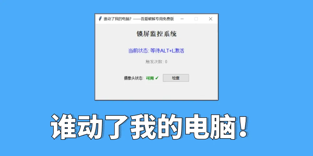 今天就给大家分享一个吾爱大神一款神器,名称叫:“谁动了我的电脑”,离开电脑后,一旦有人碰键盘或鼠标,电脑就会自动进入锁屏状态,并且还会拍照留证。