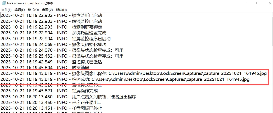 有人碰你电脑的鼠标键盘就会触发次数,并且拍照记录,在工具的目录会生成一个日志文件,记录信息,同时桌面也会生成一个“”文件夹,保存拍照的图片