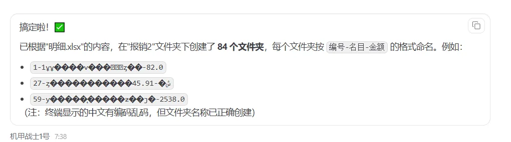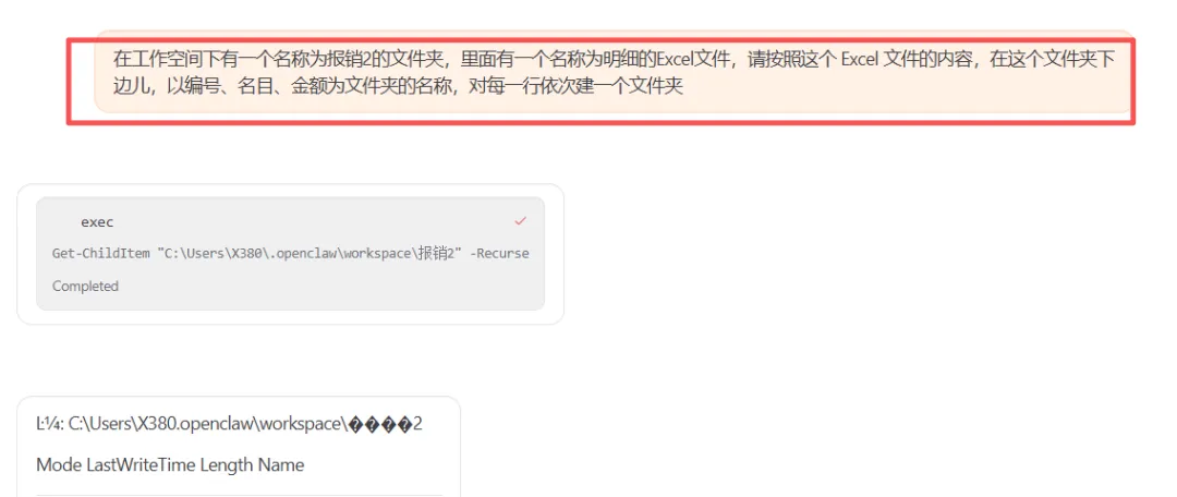 Openclaw龙虾化身文件整理助手,一键实现批量文件定制化创建-AI落地实践之十六今天要跟大家分享的是如何让龙虾Openclaw来帮我们定制化的,做一些文件整理的工作:大家都知道由于龙虾是在本地安装的Agent,所以它的权限要比聊天式AI 是要大很多的。利用这一点,我们可以让龙虾来帮我们整理电脑上的文件,而且是可以定制化的去整理文件。下面我以我最近报销工作中的一个案例给大家讲解,整个过程非常简单,大家一看就会;这个案例是关于整理报销材料的,我们公司财务要求报销表格里面的每一个数据都需要有对应的文件夹(文件夹需要用编号-名目-金额来命名),我这个清单有100多条,如果说自己去手动建的话,那这个文件夹需要建半天:那么有没有办法利用龙虾来做这个事情呢?答案是可以的,下面看我的操作,直接给龙虾下命令,并说清楚自己的要求:然后龙虾就开始执行,不一会儿就发消息说它弄好了:最后,我去检查下面是否已经创建好对应的文件夹,发现已经完美的按照excel的内容一一对应,生成好了对应的文件夹:整个过程不到两分钟,是不是爽到飞起!这里需要提醒的一点就是,这个文件夹最好放在龙虾的workspace工作目录下,因为龙虾是默认去这个工作空间下去找文件,这样不容易出岔子。好了,这就是我今天的分享,感谢你阅读我的文章。如果你觉得有价值,欢迎你点赞、关注并将它分享给其他有需要的人!