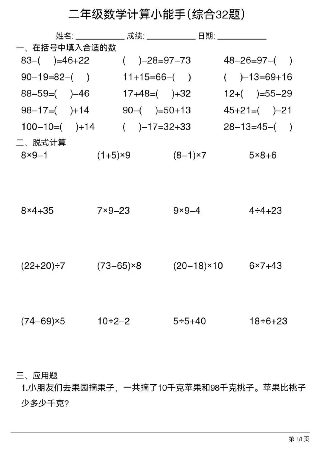 本资料专为二年级下册数学设计,精选32 道综合计算题,覆盖表内除法、有余数的除法、混合运算、整百整千加减法、万以内加减法四大核心考点,题型规范、难度适中,一页 32 题、排版紧凑、可直接打印,适合课堂速算、家庭作业、口算训练、计算能力提升,是夯实计算基础、提高速度与准确率的实用练习资料。