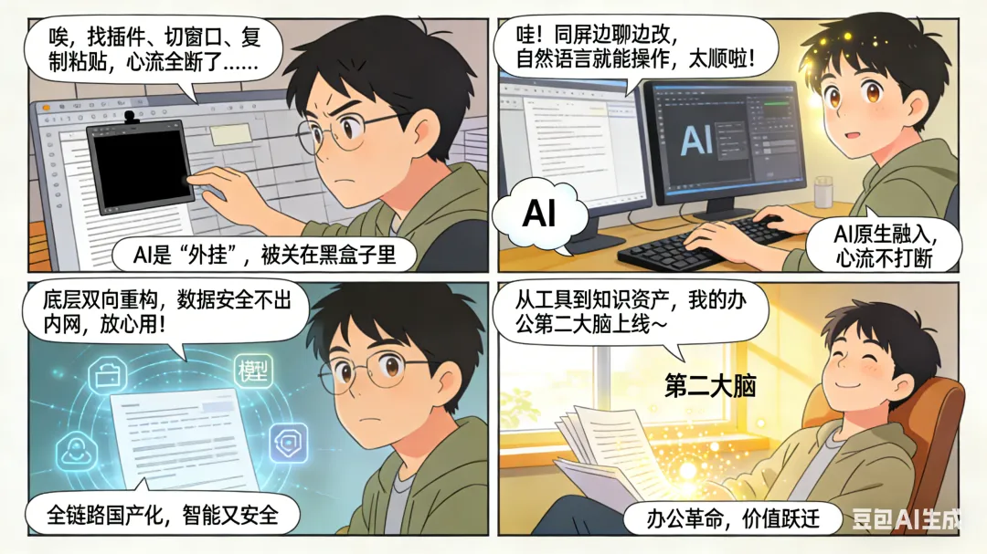 以前用Office插件,得自己在菜单里找、弹个小窗口、来回切,AI就是个"黑盒工具",你得学会怎么跟它说话。