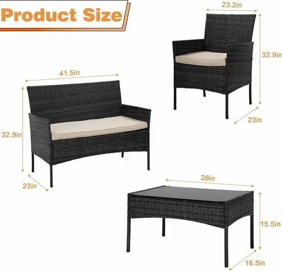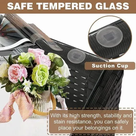 采用弹性PE藤条编织而成,粉末涂层钢制框架,配备高密度回弹海绵座垫,坐感舒适,专为户外设计,简约大方,耐候抗紫外线,茶几顶部带钢化玻璃台面,易于清洁。