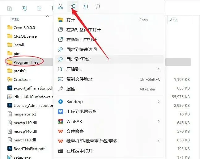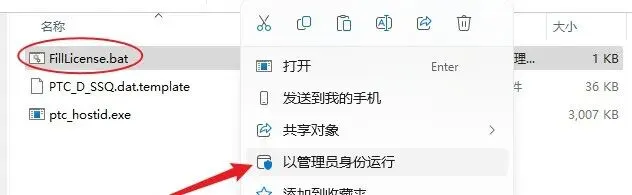 5.打开刚刚复制的文件夹,依次打开路径【C:\Program Files\PTC】,鼠标右击【FillLicense】选择【以管理员身份运行】。