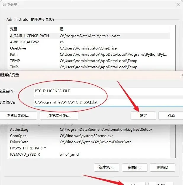 和变量值【C:\ProgramFiles\PTC\PTC_D_SSQ.dat】,然后依次点击【确定】。