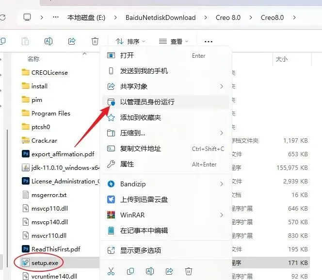 12.打开解压后的【Creo.8.0】文件夹,鼠标右击【setup】选择【以管理员身份运行】。