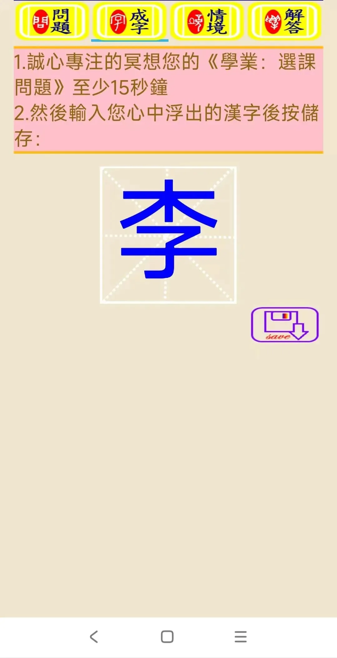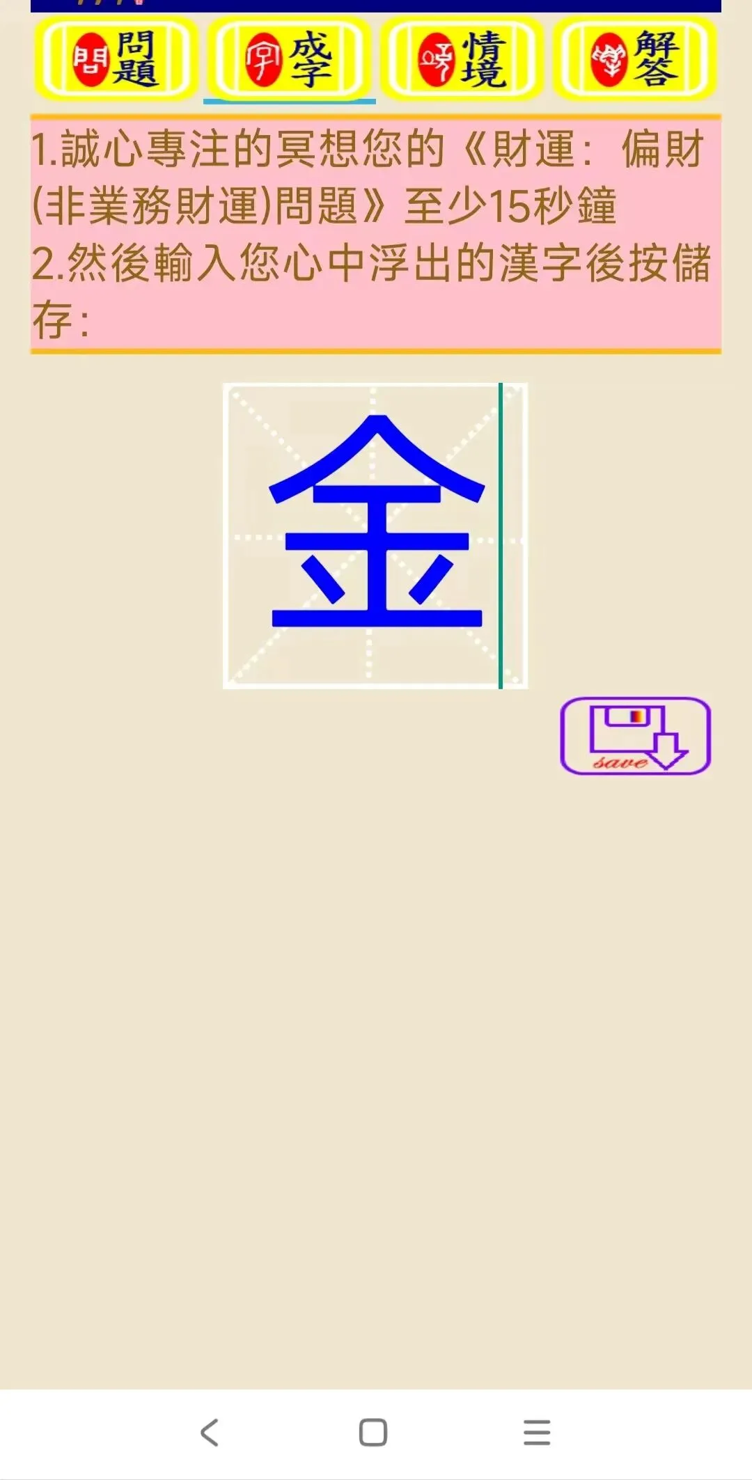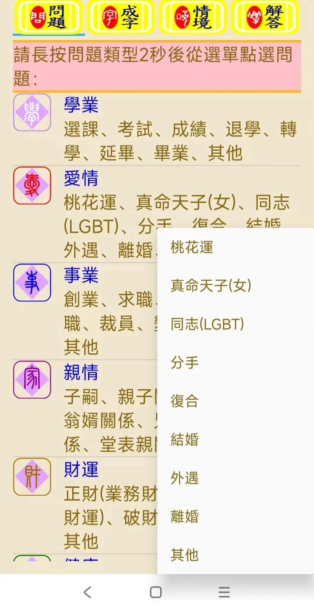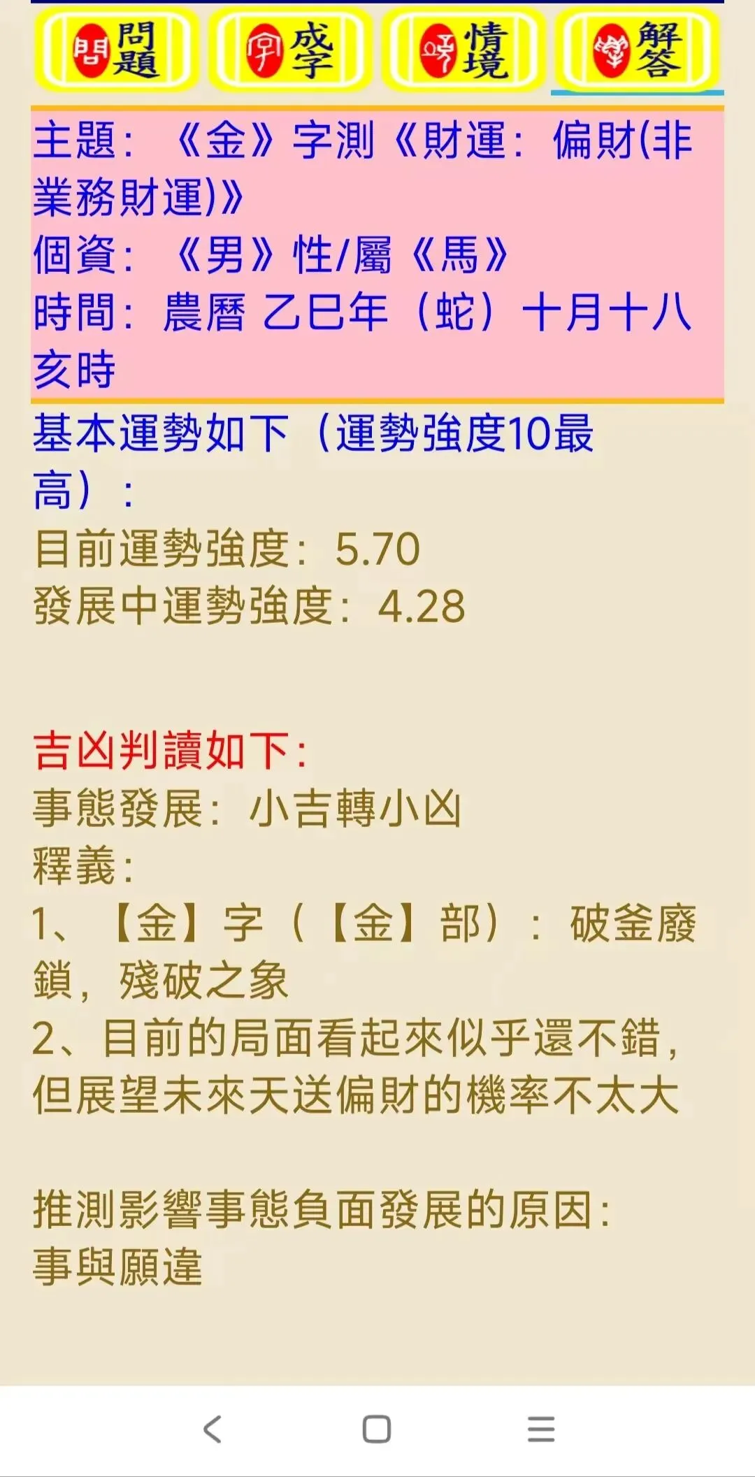 台湾新版安卓手机版的测字软件,依据《测字学基础》一书为基础,可以测学业、爱情、事业、亲情、财运、健康、友情、其他等。本测字应用程序目前已初步包含《测字学理论模型》的多种字理解析技术。
