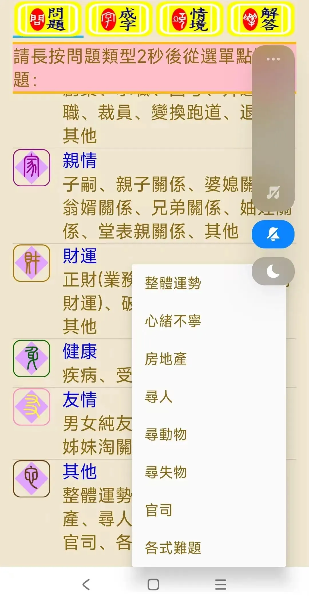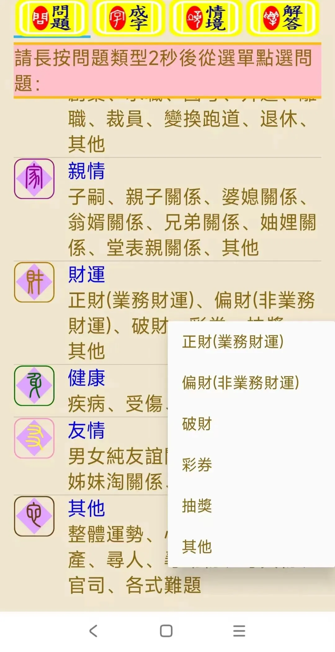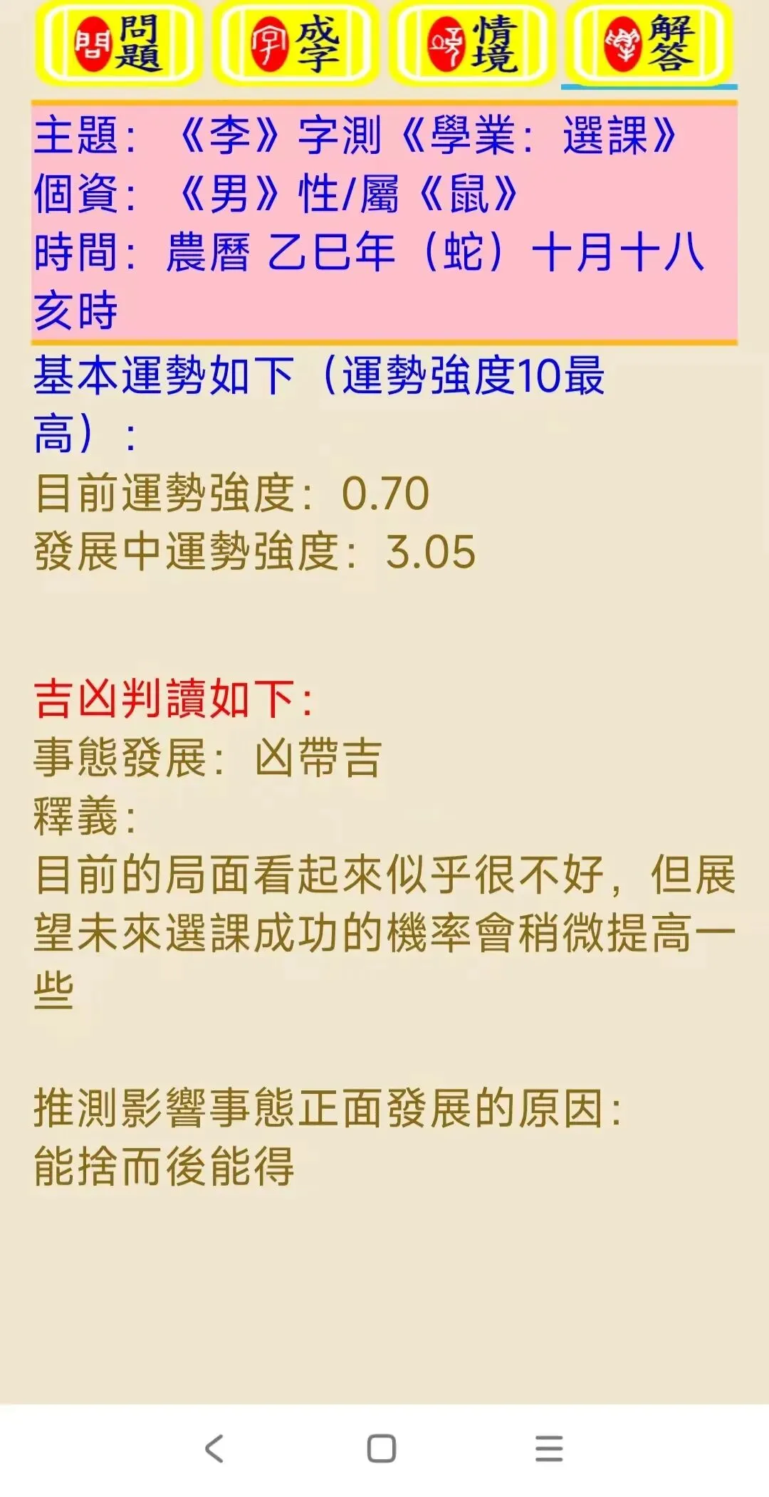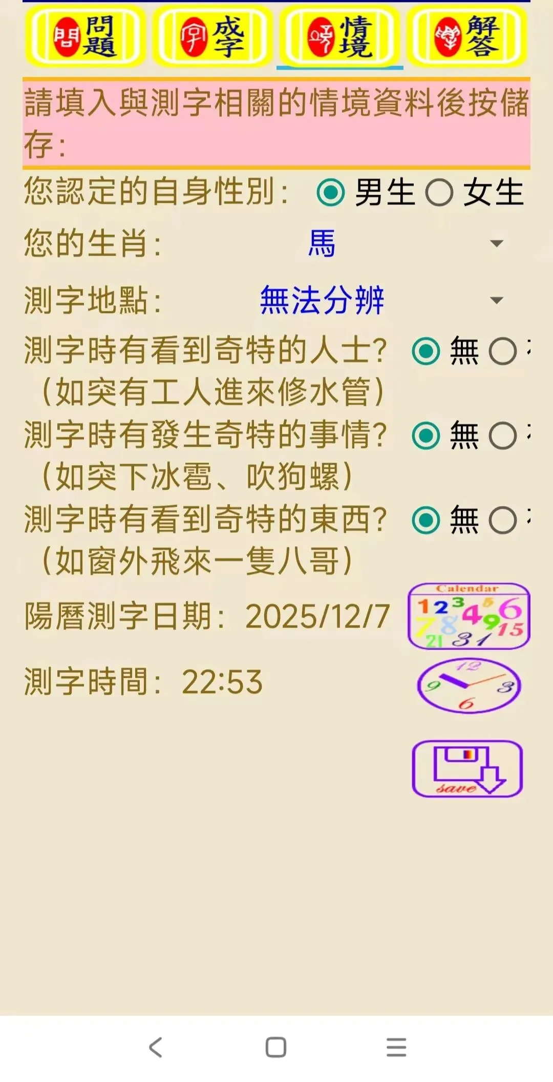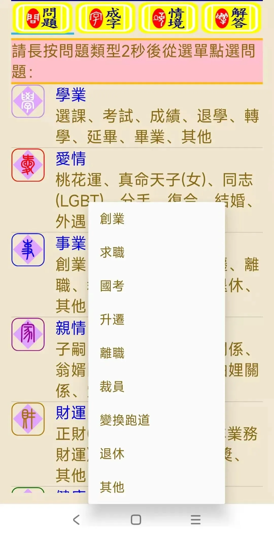 台湾新版安卓手机版的测字软件,依据《测字学基础》一书为基础,可以测学业、爱情、事业、亲情、财运、健康、友情、其他等。本测字应用程序目前已初步包含《测字学理论模型》的多种字理解析技术。