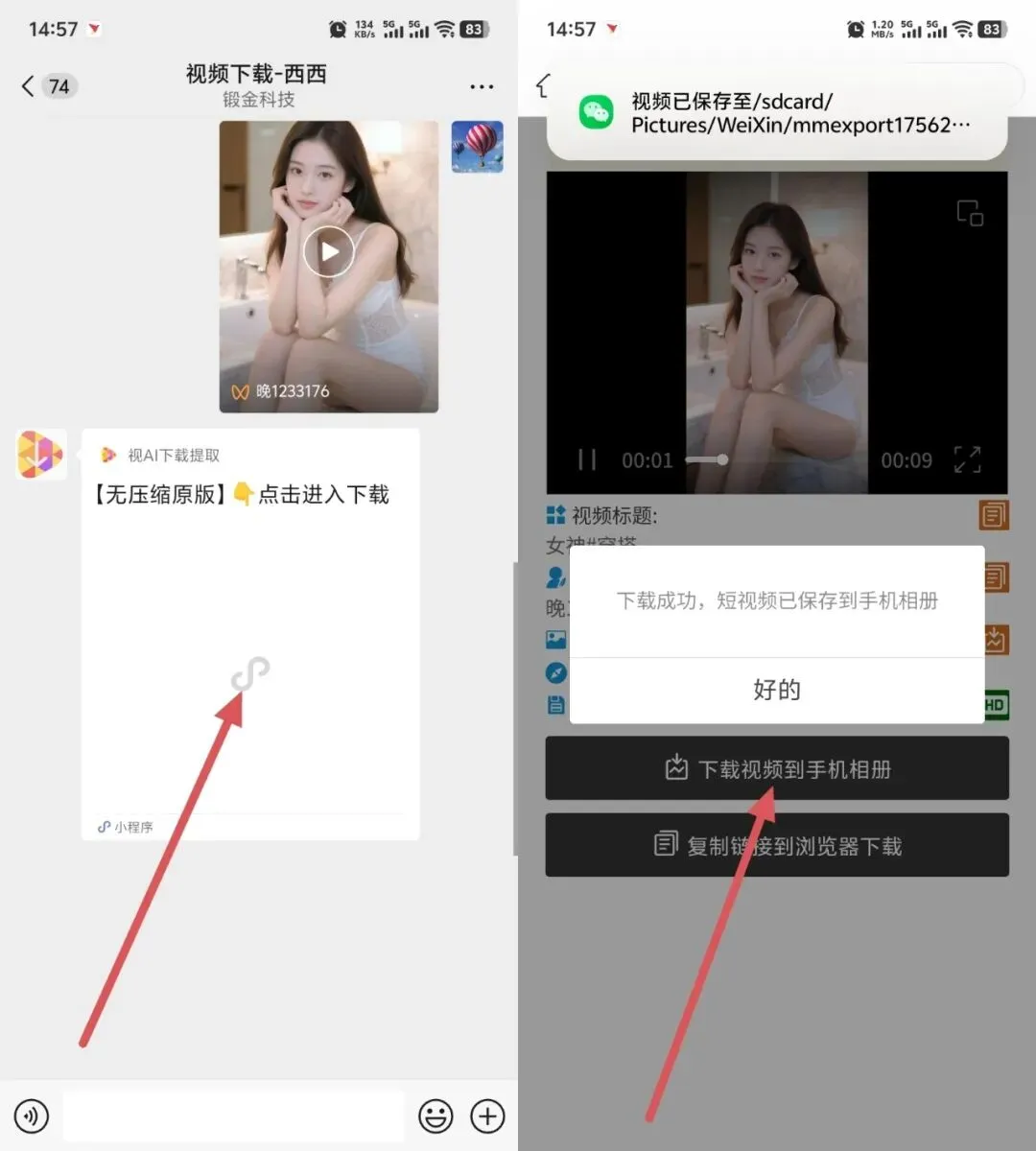 自动解析:机器人会立即解析视频 → 返回下载小程序 → 点击进入小程序 → 一键保存到手机相册 ✅