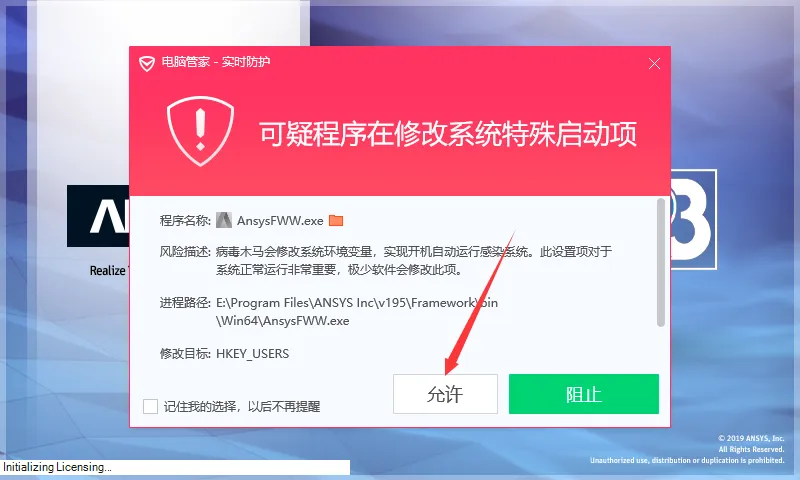 19、杀毒软件弹出拦截提示,需要点击允许,避免拦截后证书无法正常运行。