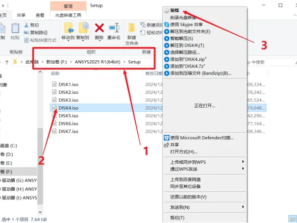 43.打开安装包解压后的【ANSYS 2025 R1(64bit)】文件夹中【Setup】文件夹,鼠标右击【DISK3】选择【装载】(注意留意装置后的磁盘符,在步骤46将会选择SIDK2装载的磁盘,不同用户这里装置之后磁盘符可能不一致