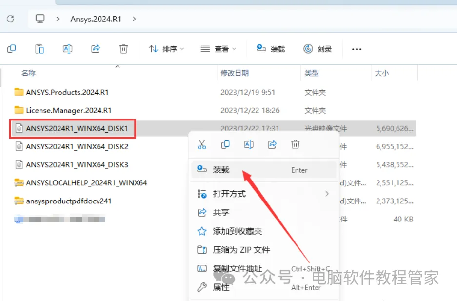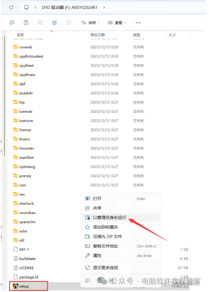 2.1、装载或解压ANSYS2024R1 WINX64.iso文件,以管理员身份运行setup.exe文件