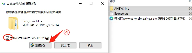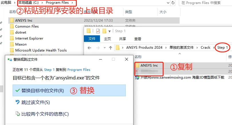 2.7、返回安装包文件夹,依次进入“单独的激活文件/crack/Step 1”文件夹,复制“ANSYS Inc”文件夹,粘贴到刚安装的程序文件夹替换(默认路径 C:\Program Files\)
