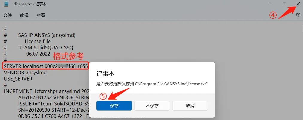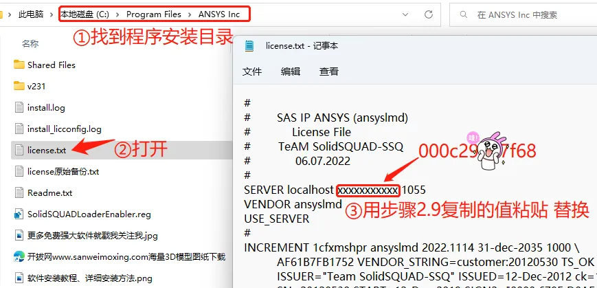 2.10、在步骤2.7操作的安装程序文件夹“ANSYS Ins”内(我这里是默认安装路径),打开license.txt,,粘贴上一步复制的值,替换,保存并关闭