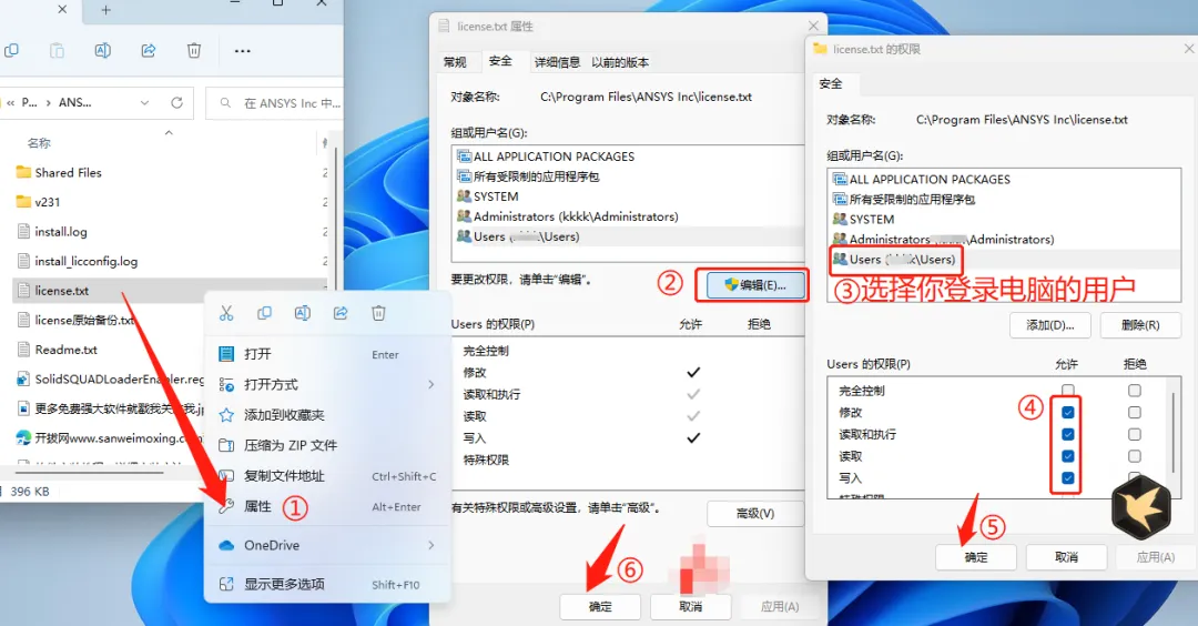 注意:在win10/11中,可能会提示无权限修改或保存,请在license.txt右键-属性,找到用户名“Users”增加修改/写入权限,点击确定即可