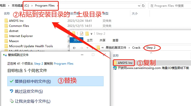 4.1、返回安装包文件夹,依次进入“单独的激活文件/crack/Step 2 ”文件夹,复制“ANSYS Inc”文件夹,粘贴到刚安装的程序文件夹替换(默认路径 C:\Program Files\)