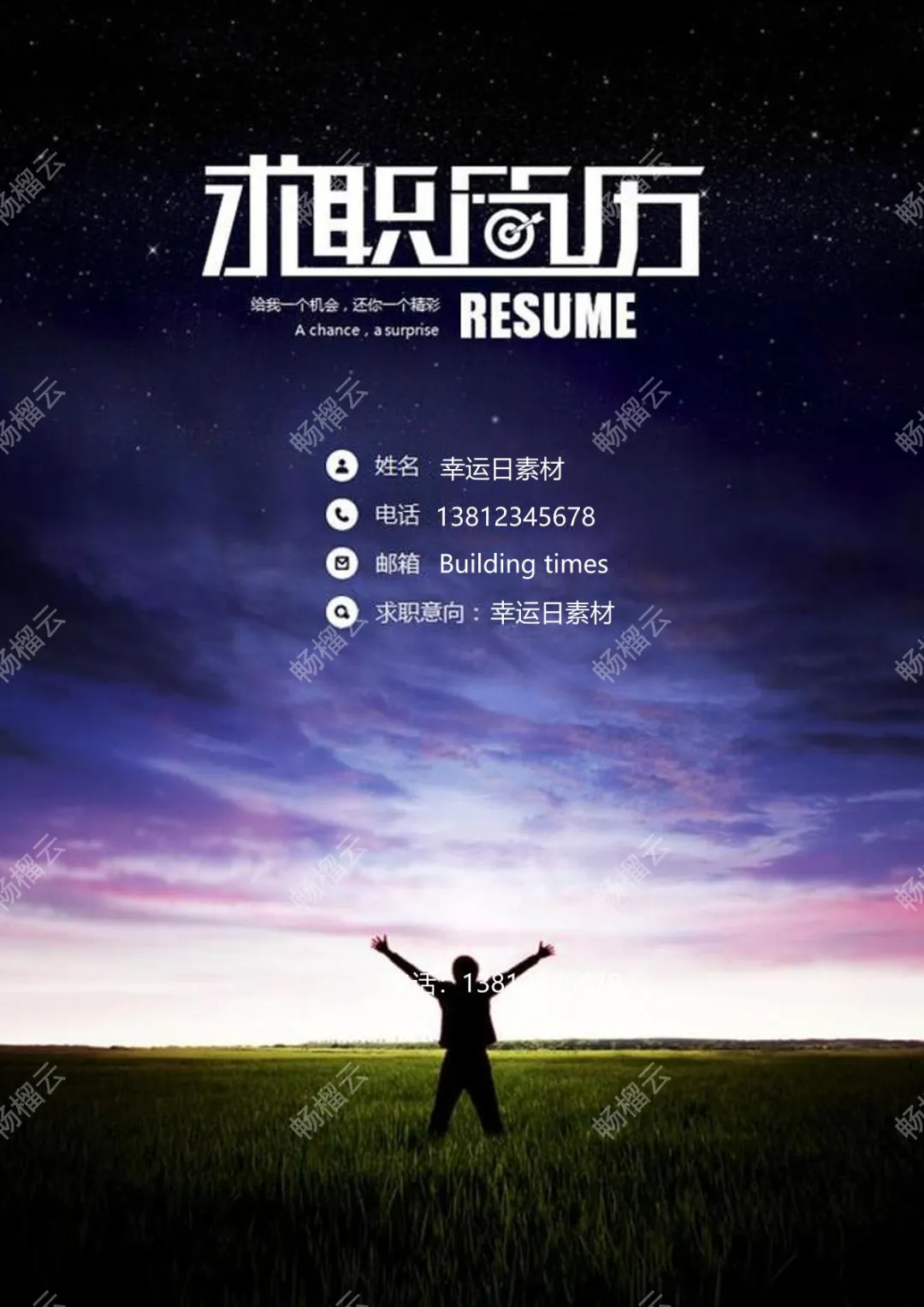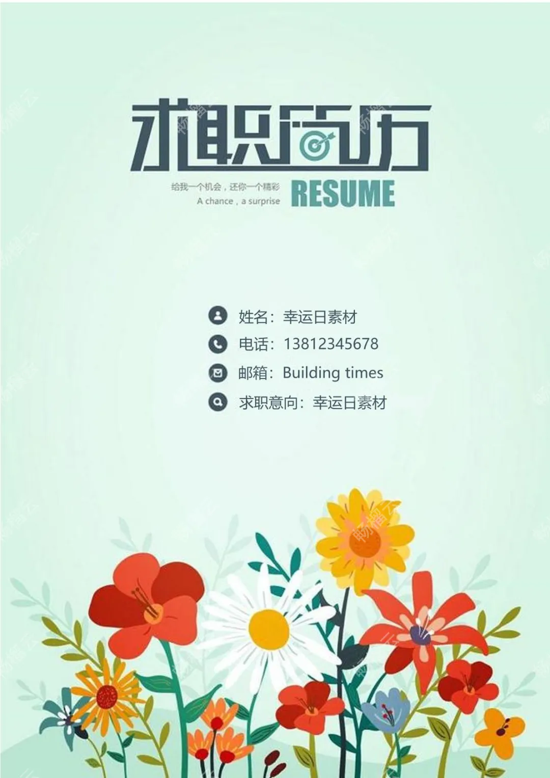 展示幸运日素材的求职意向信息,包含联系电话13812345678、邮箱Building times,可获取相关求职对接信息。