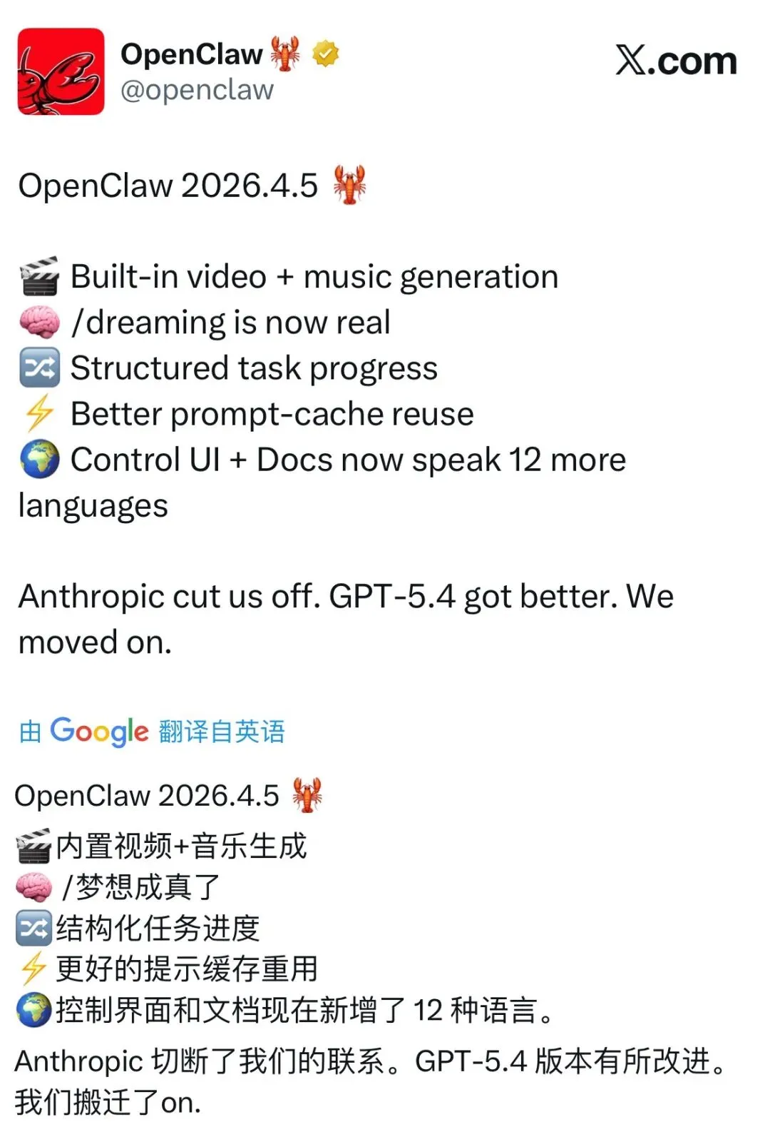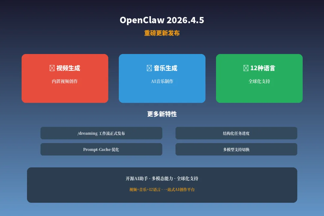 2026年4月5日,OpenClaw 发布了 2026.4.5 版本更新。这次更新堪称重磅,带来了三大核心能力:内置视频生成、音乐生成,以及支持 12 种语言的全球化界面。