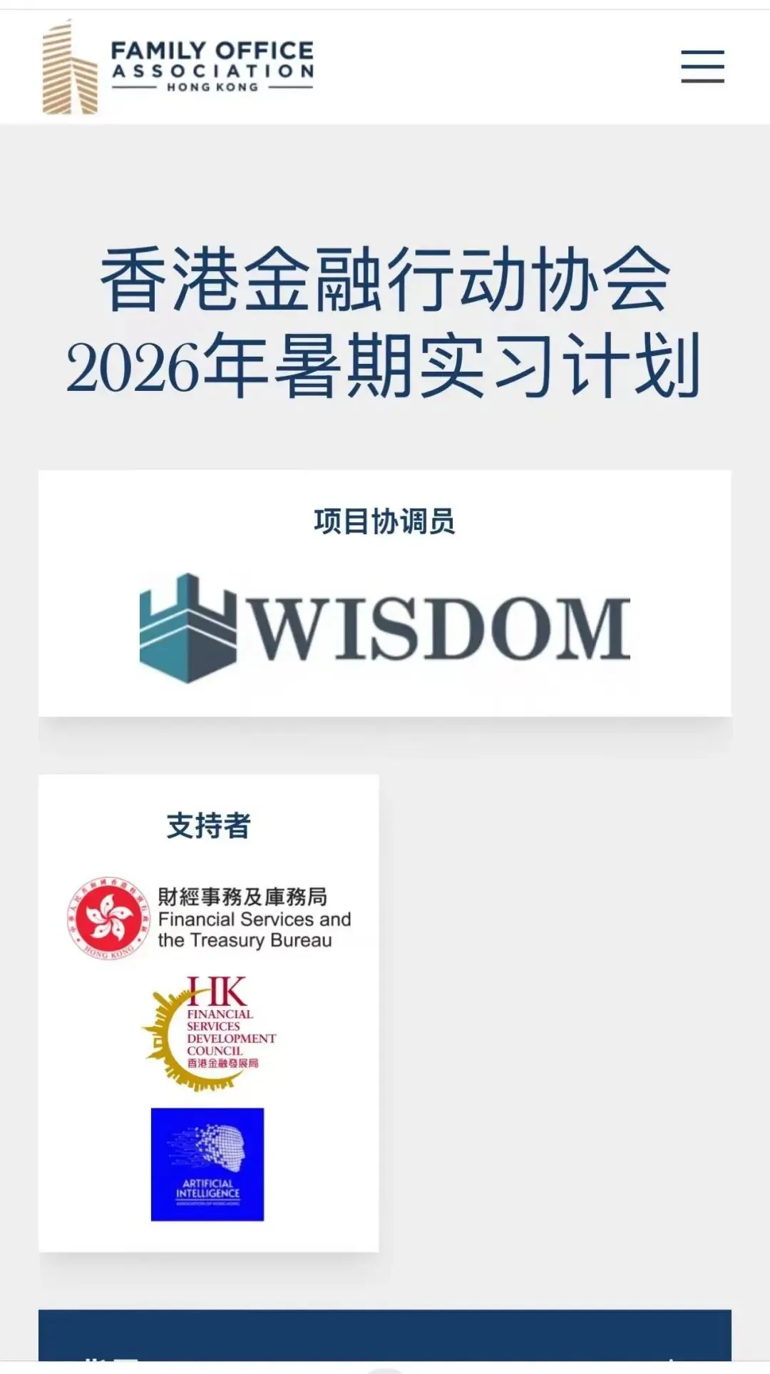 香港 Family Office 协会(Family Office Association Hong Kong) 是香港家族办公室领域的权威行业组织,本次 2026 年暑期实习计划由香港财经事务及库务局、香港金融发展局等政府部门官方支持,聚焦香港家族办公室、财富管理行业发展,为学生提供深度参与香港高端金融行业的顶级平台。合作企业 Wisdom 是香港家族办公室领域的核心机构,实习将深度对接行业资源。