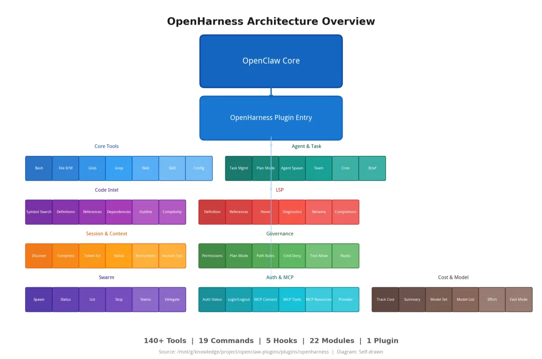 OpenHarness 是一个设计精良的统一插件,将 140+ 工具、19 个命令、5 个钩子、22 个模块集成在一个包中。它的分层架构使得每个模块职责清晰、互相补充。