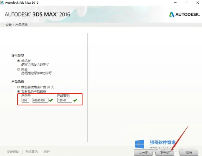 5.许可类型中选择“单机许可”选项。序列号中输入666-69696969或 667-98989898,产品密钥为128H1,点击下一步