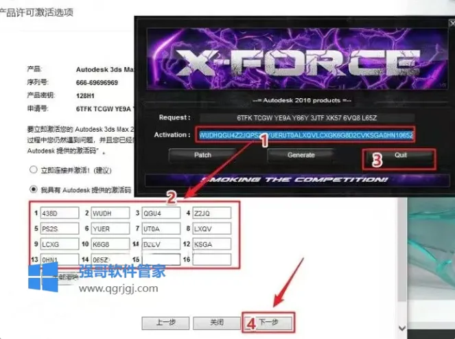 16.输入激活码:①使用快捷键“Ctrl+C”复制【Activation】后框中的激活码;②使用快捷键“Ctrl+V”将激活码粘贴到【激活码输入框】中;③点击【Quit】;④点击【下一步】