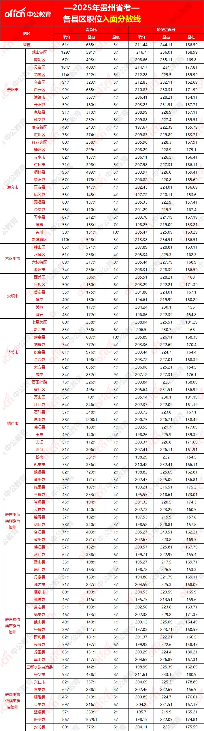 以上为贵州省考普通岗位各区县的进面情况,分数为300分制!