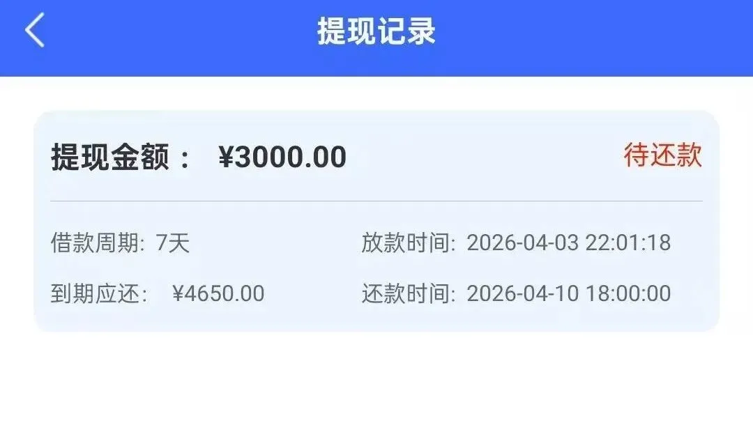 3000元借款10天需还款4650元,年化利率超1500%,远超红线。其陷阱还体现在暗箱操作与违规收费上,下款资金均来自私人账户,而非正规金融机构,平台以“服务费”为名收取高额砍头息,实际到账金额大幅缩水却按全额计息。