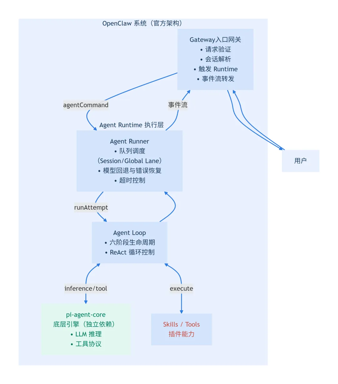 OpenClaw系统架构如下所示,会话请求经过Gateway解析后,通过agentCommand进入Agent Runtime执行层,分为2个阶段Agent Runner和Agent Loop阶段,后面我们分别介绍。