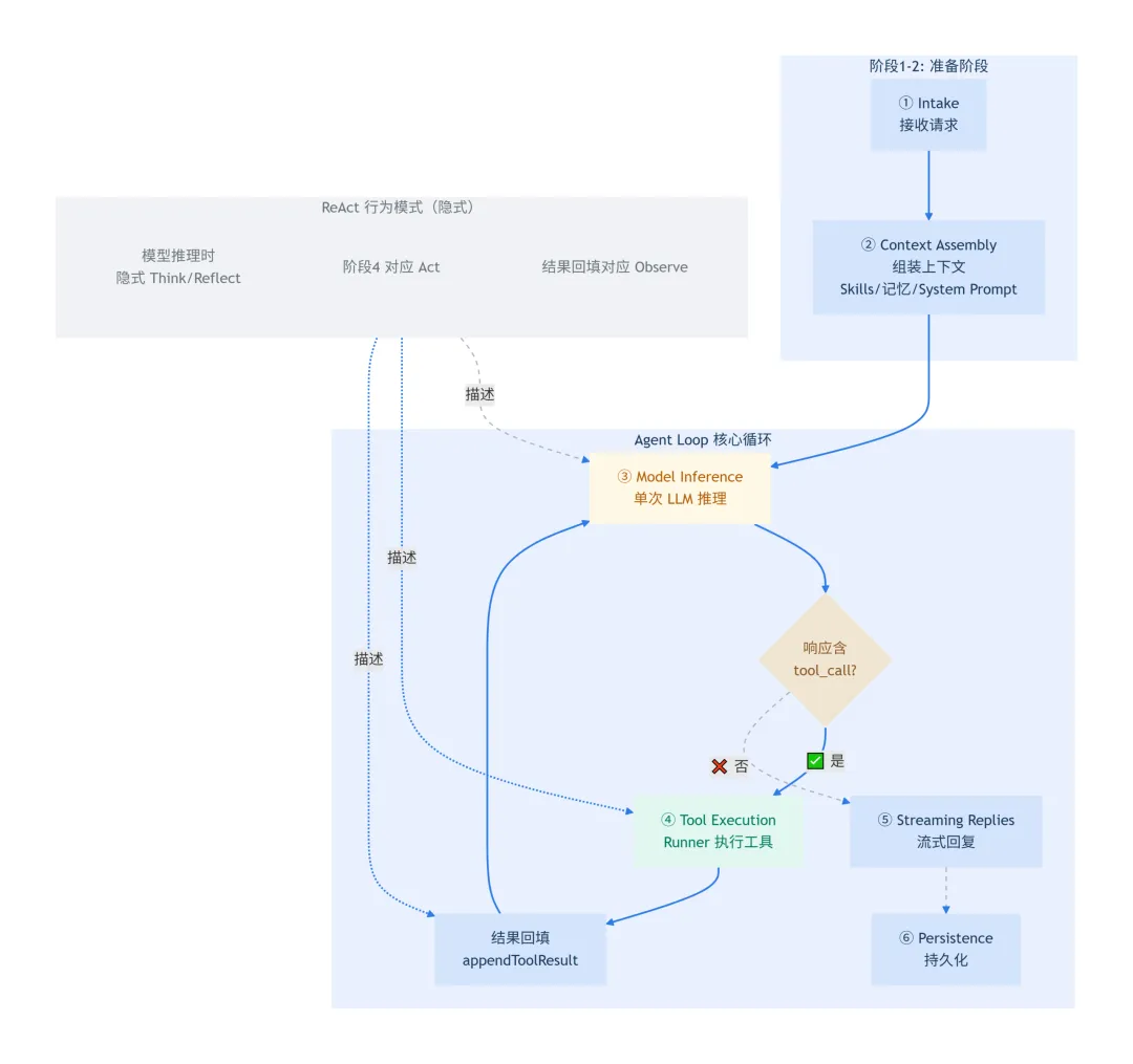 intake 接收 context assembly 上下文组装 model inference 模型推理 tool execution 工具执行 streaming replies 流式回复 persistence 持久化