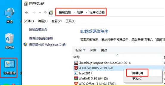 1. 关闭所有SolidWorks相关进程,打开「控制面板」→「程序和功能」(Windows 11可通过「设置」→「应用」→「应用和功能」找到);