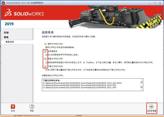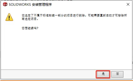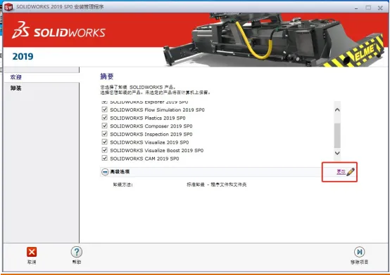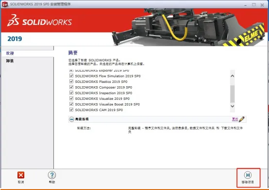 3. 进入安装管理程序后,选择「删除」(Remove)选项,勾选「删除所有SolidWorks组件」,包括主程序、Toolbox、Simulation等所有相关插件;
