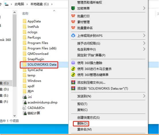 6. 工具箱数据目录:若存在「C:\SolidWorks Data」文件夹,也需一并删除。