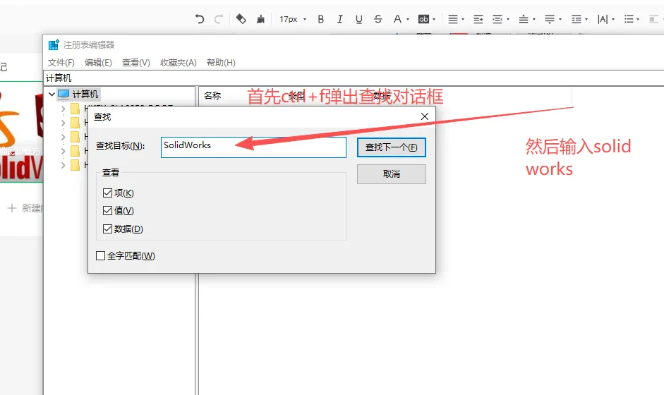 2. 点击注册表编辑器顶部的「编辑」→「查找」,输入关键词「SolidWorks」(不分大小写),勾选“全字匹配”,点击「查找下一个」;