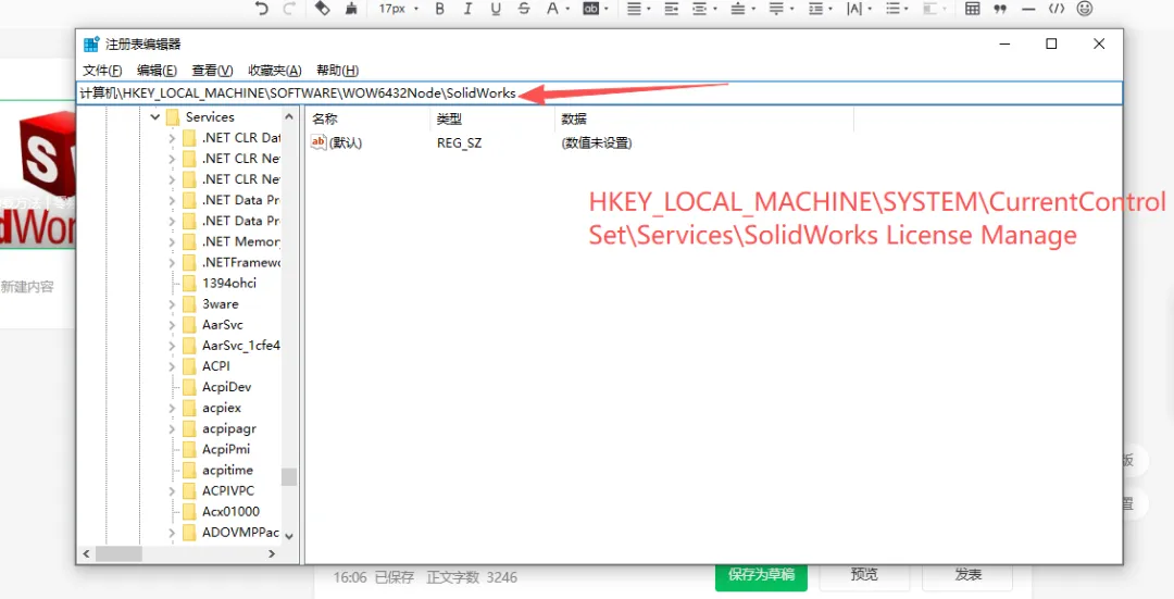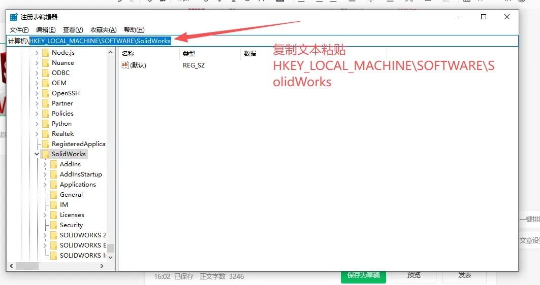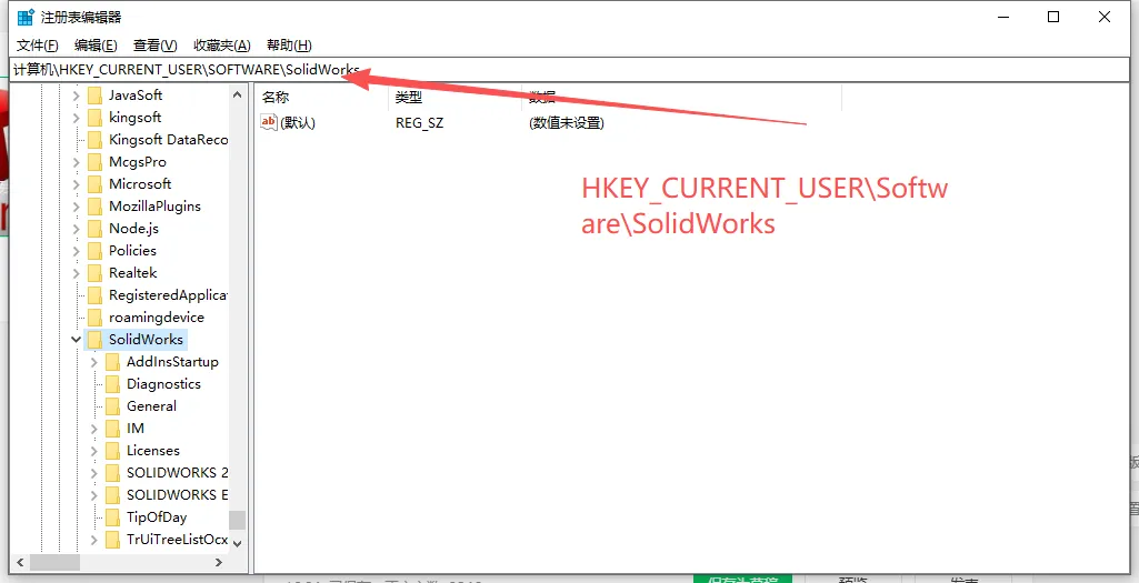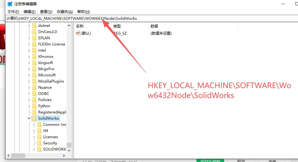 - HKEY_LOCAL_MACHINE\SOFTWARE\Wow6432Node\SolidWorks(64位系统上的32位信息,若存在);