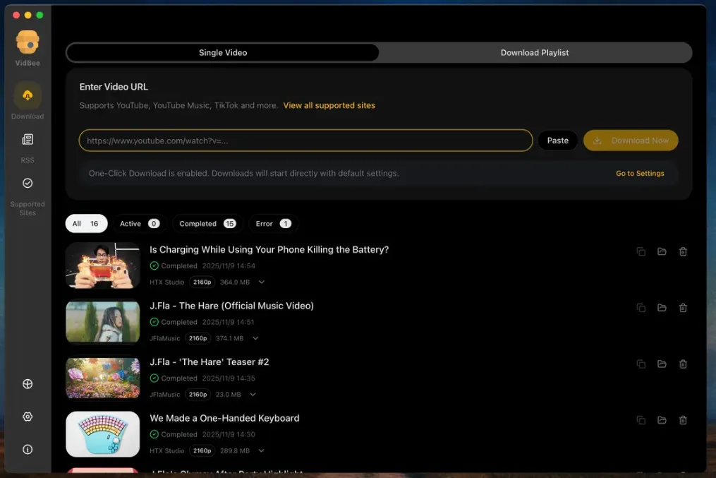 你只需要订阅某个创作者的频道 RSS 链接,VidBee 就会在后台自动监控。只要博主一更新,它就自动帮你下载到本地,完全不用你再去手动去盯更新、复制链接、点击下载。