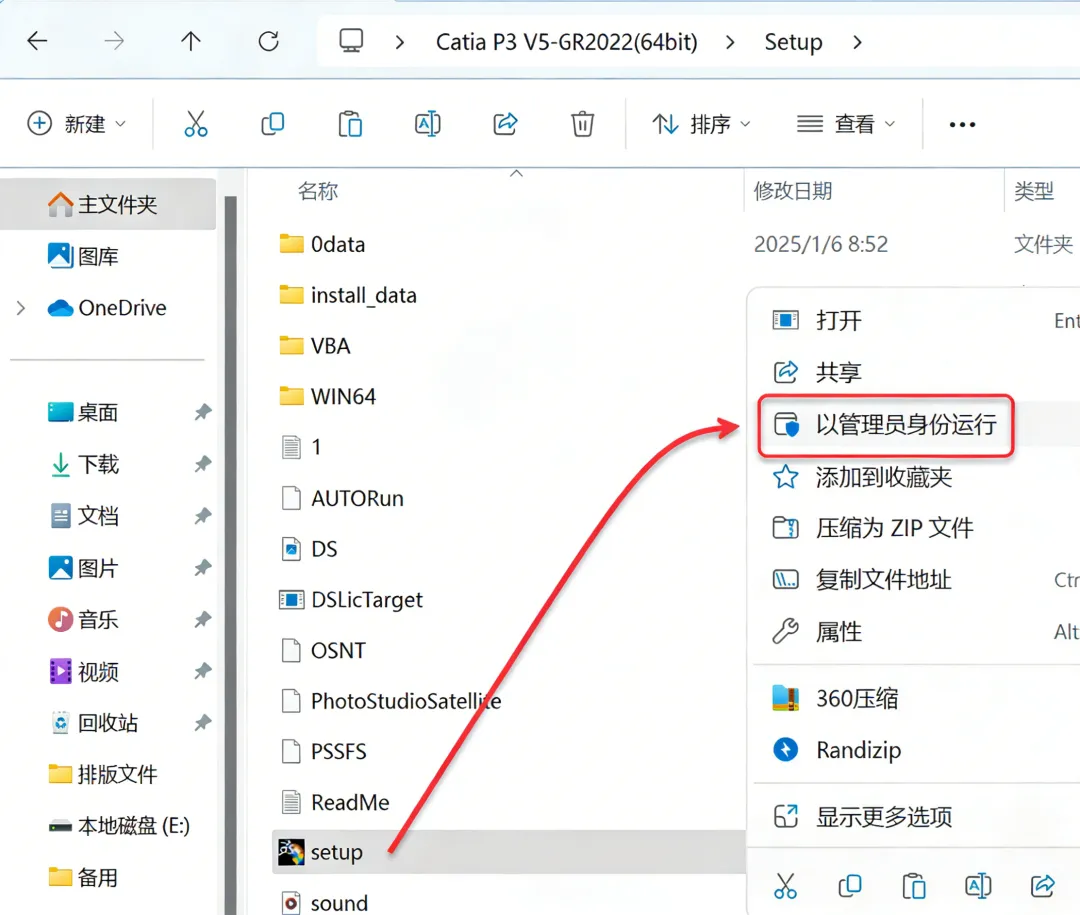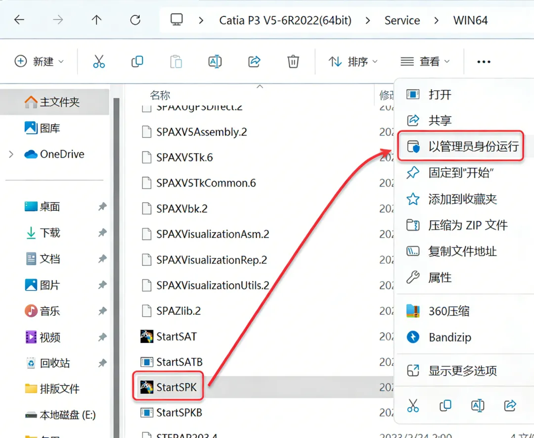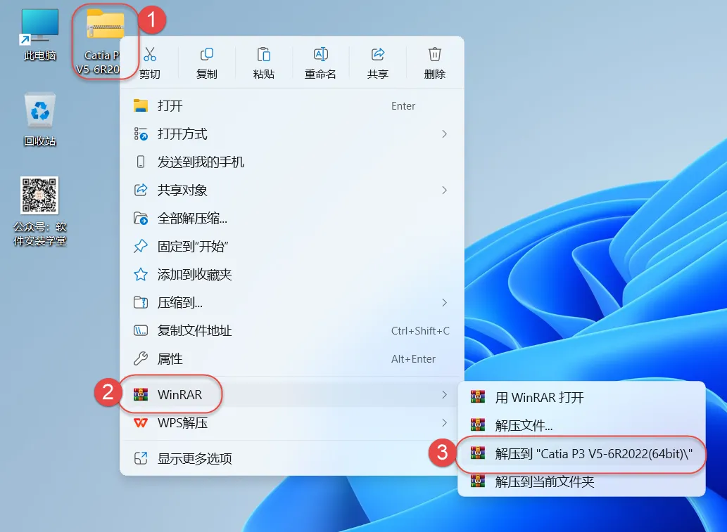 1.解压安装包:①鼠标右击【Catia P3 V5-6R2022(64bit)】压缩包②选择电脑上安装的解压软件(如:360压缩)③点击【解压到Catia P3 V5-6R2022(64bit)】。