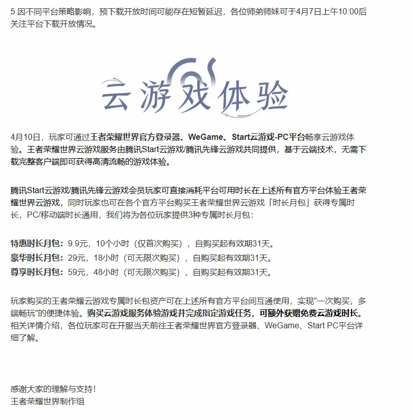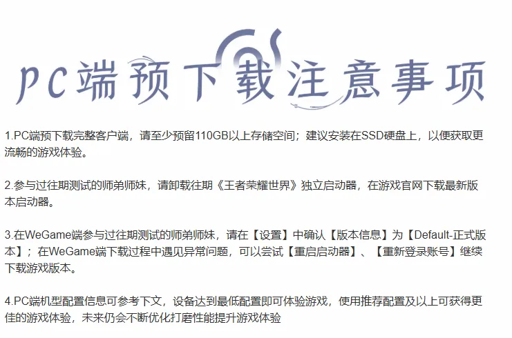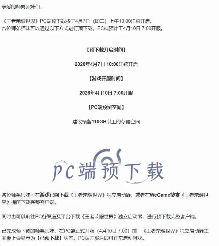 《王者荣耀世界》官方发布公告,预告4月7日上午10点陆续开启预下载!需要空间110GB以上,笔记本设备4K配置推荐4090显卡。