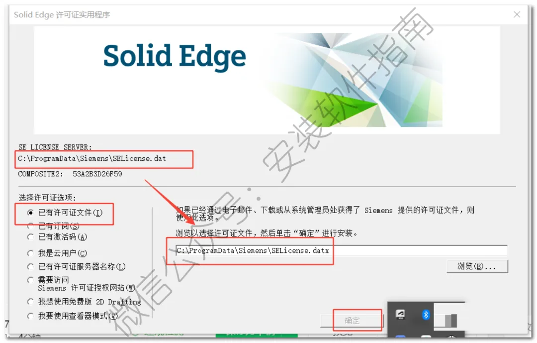 32.选择【已有许可证文件】将【C:\ProgramData\Siemens\SELicense.dat】复制到【浏览处】,点击【确定】