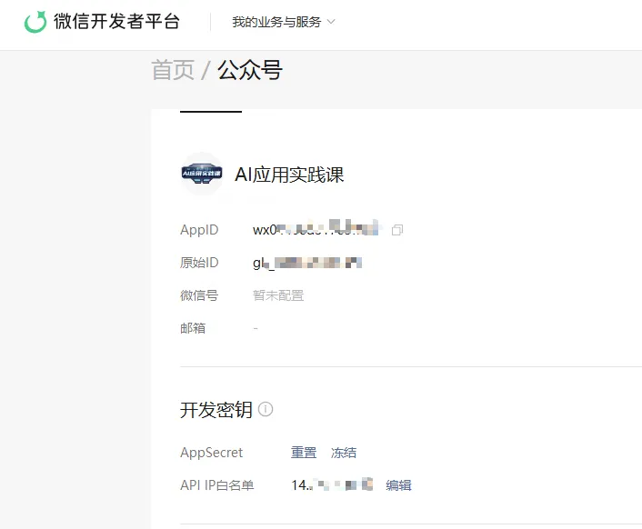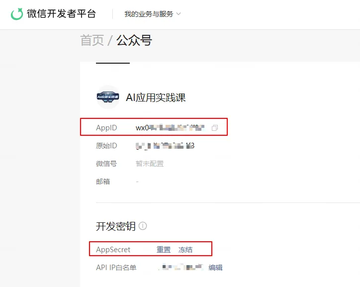 继续在微信开发者平台获取AppID 和 AppSecret, AppSecret第一次需要设置,自己保存,否则忘记只能重置。
