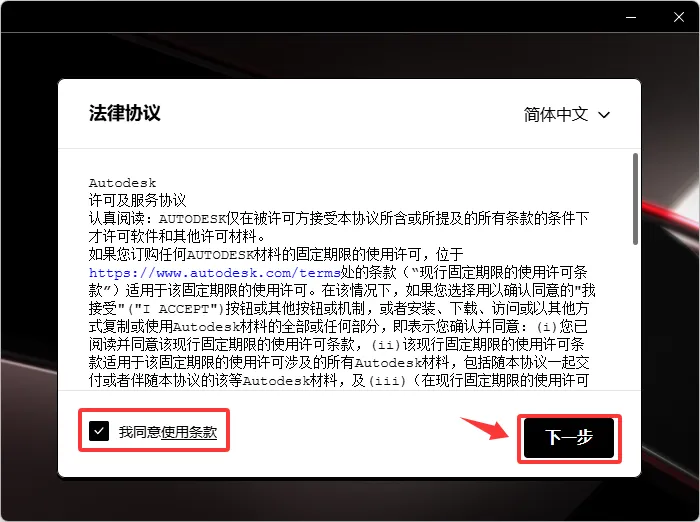 第2步,【勾选】我同意使用条款,点击“下一步”