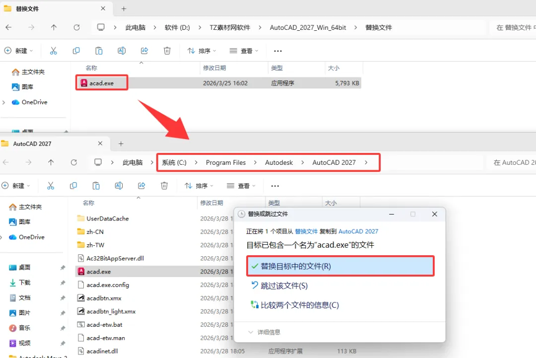 第8步,将"acad.exe"文件替换到CAD软件的安装目录中,如果第三步没有修改安装路径,默认位置C:\Program Files\Autodesk\AutoCAD 2027