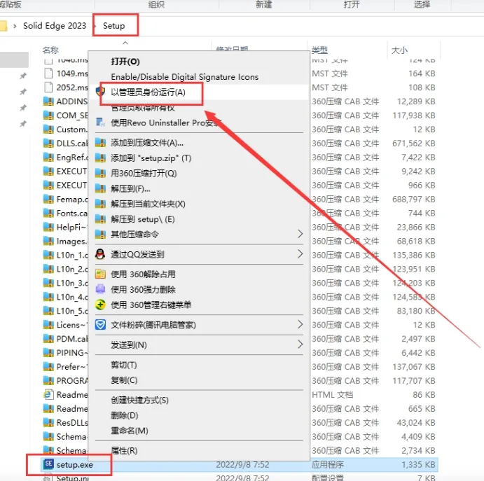 2. 打开【Setup】文件夹,选择【setup.exe】应用程序,鼠标右键以管理员身份运行。