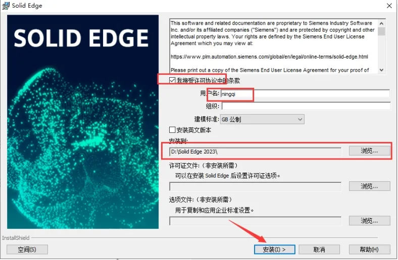 3. 首先勾选软件许可协议接受,接着输入用户名,然后更改安装位置(更改安装位置不能带有中文或特殊符号),最后点击【安装】。