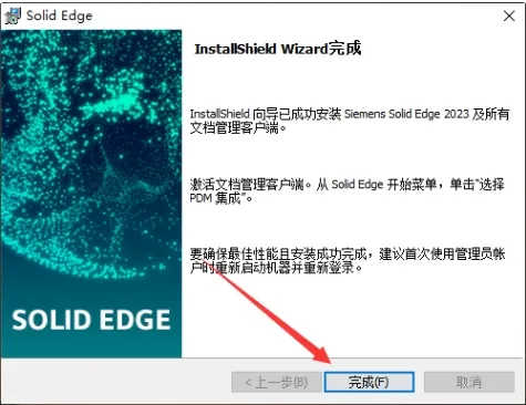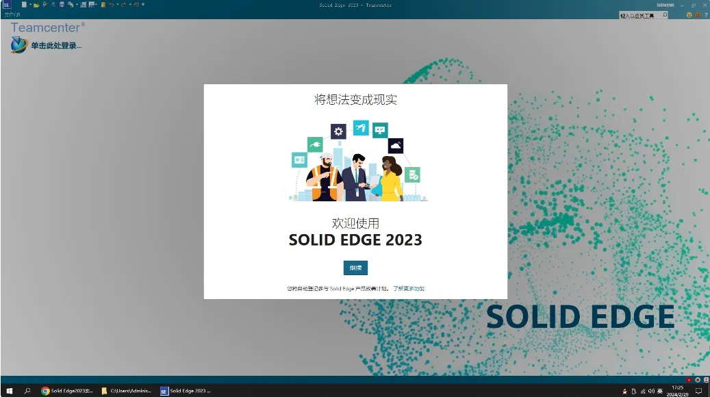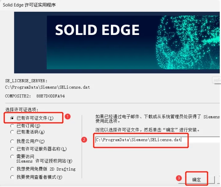 14. 打开电脑桌面的【Solid Edge 2023】软件,进入界面。①选择【已有许可证文件】②输入【C:\ProgramData\Siemens\SELicense.dat】③点击【确定】。