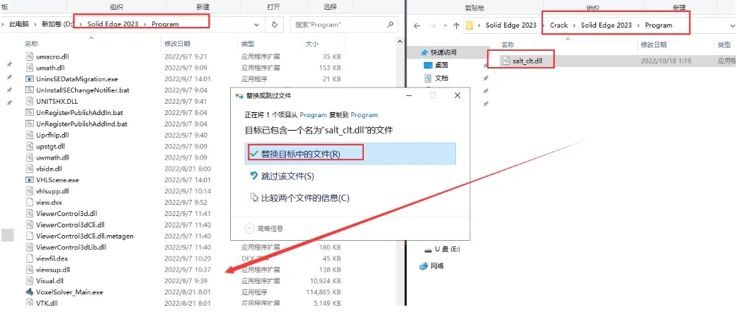 7. 将安装包【Crack\Solid Edge 2023\Program】里面的破解补丁【salt_clt.dll】复制到刚才打开的软件安装目录位置下替换。
