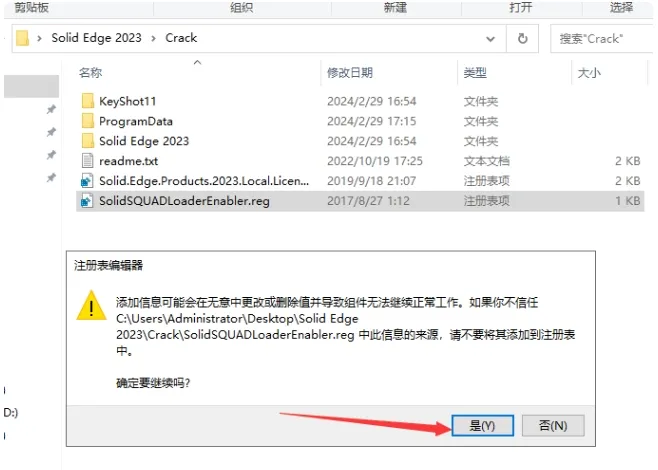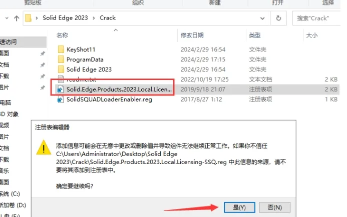 10. 双击运行【Solid.Edge.Products.2023.Local.Licensing-SSQ.reg】,弹出对话框,点击【是】。