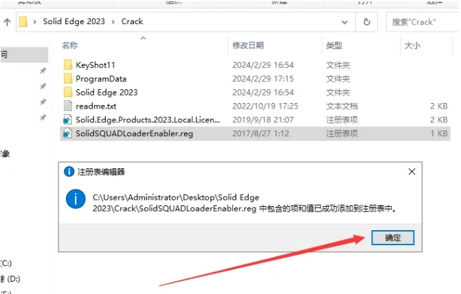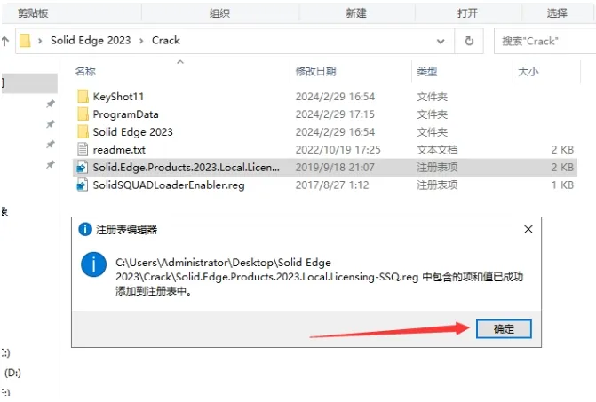 11. 【Solid.Edge.Products.2023.Local.Licensing-SSQ.reg】成功添加到注册表中,点击【确定】。