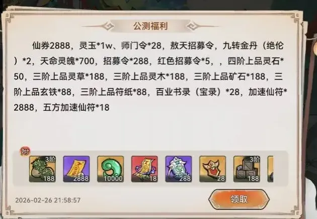仙券2888,灵玉1w、师门令 28,敖天招募令,九转金丹(绝伦)2,(普通)天命灵魄 700,招募令288,红色招募令 5,四阶上品灵石50,三阶上品灵草 188,三阶上品灵木188,三阶上品矿石 188,三阶上品玄铁88,三阶上品符纸 88,百业书录(秘录)28,加速仙符 2888,五方加速符*18