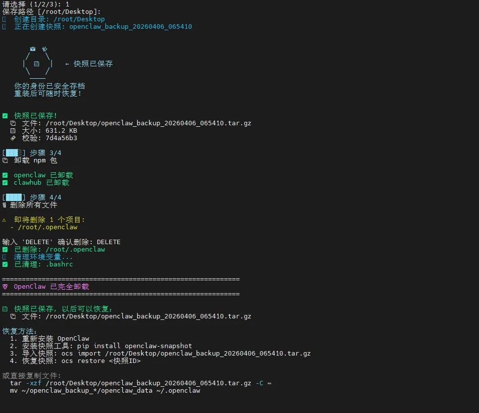 快照是这款工具的灵魂所在。它会在卸载前完整备份你的 OpenClaw 配置: